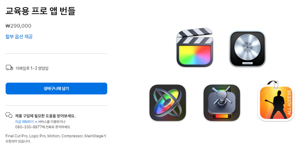 - 교육용 번들앱 가격: 299,000원 (파이널컷, 로직프로, 모션, 컴프레셔, 메인스테이지 포함)